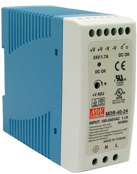 Сетевые источники питания на DIN-рейку серии MDR-40. Узкий корпус - полезен в тех случаях, когда требуется запитать одновременно и независимо много малопотребляющих устройств (например, промышленных датчиков).